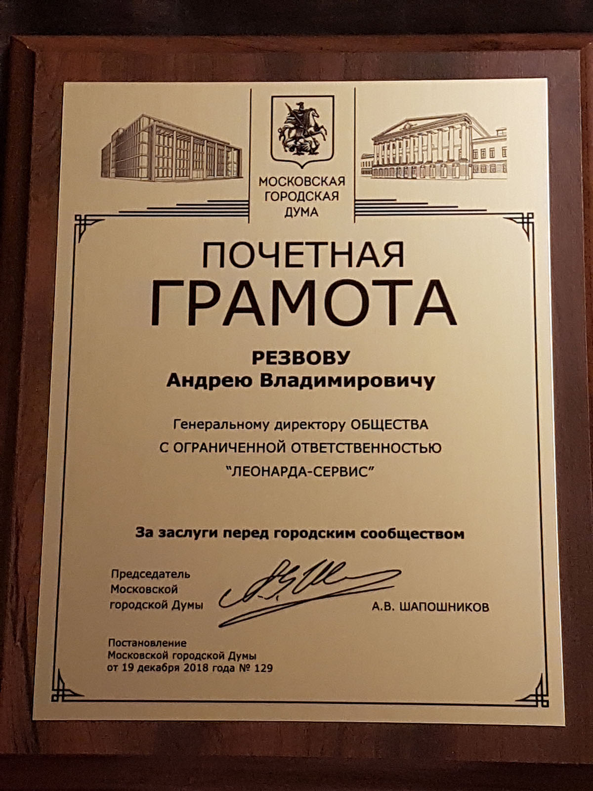 За заслуги перед городским сообществом Почетной грамотой Московской городской Думы награжден Резвов Андрей Владимирович – генеральный директор ООО «ЛЕОНАРДА-СЕРВИС».